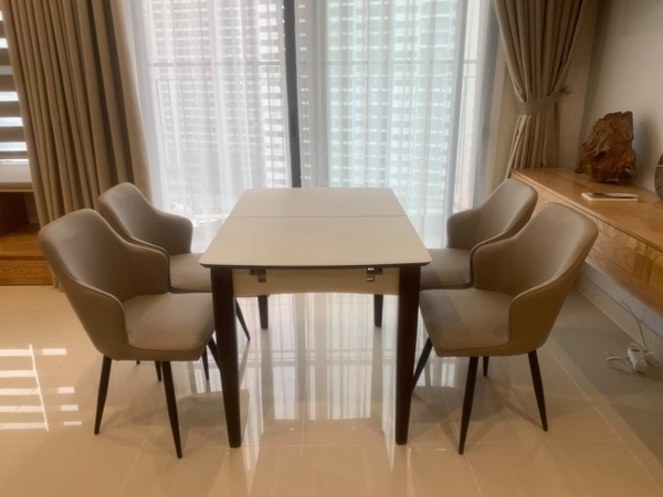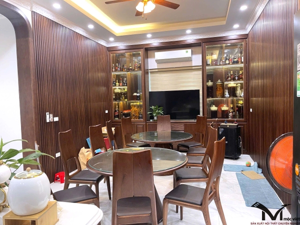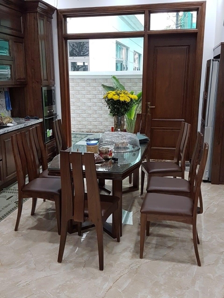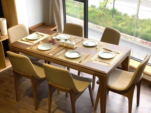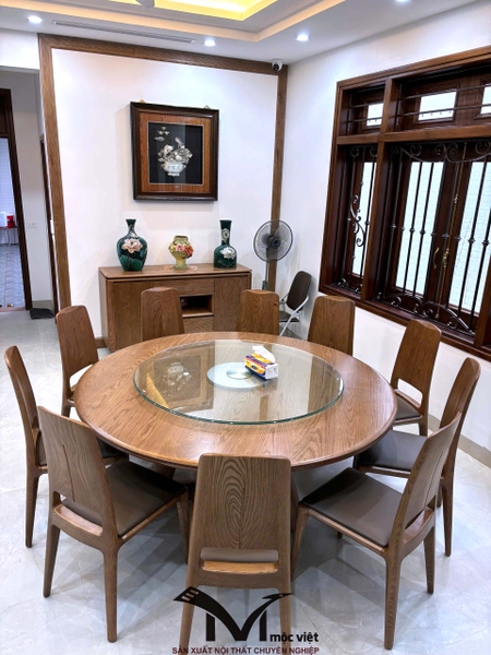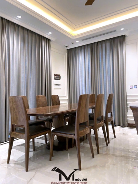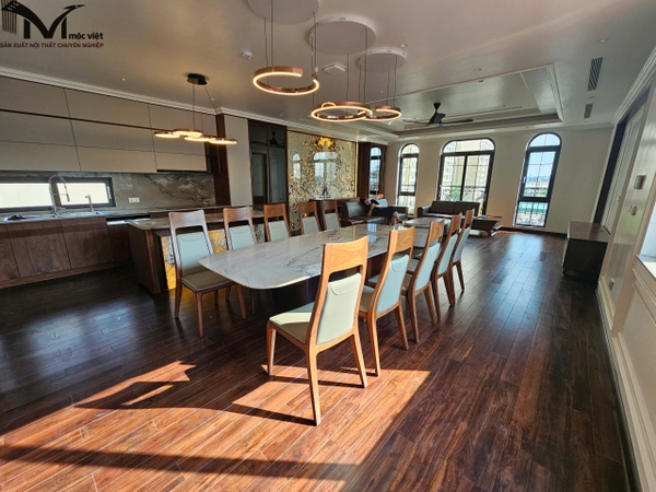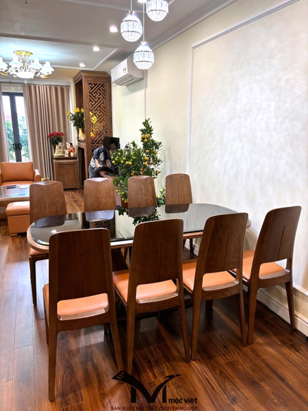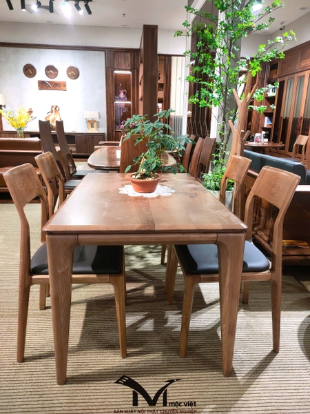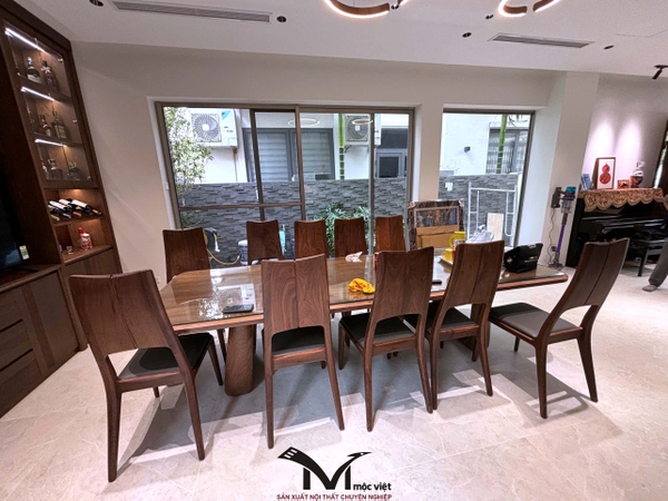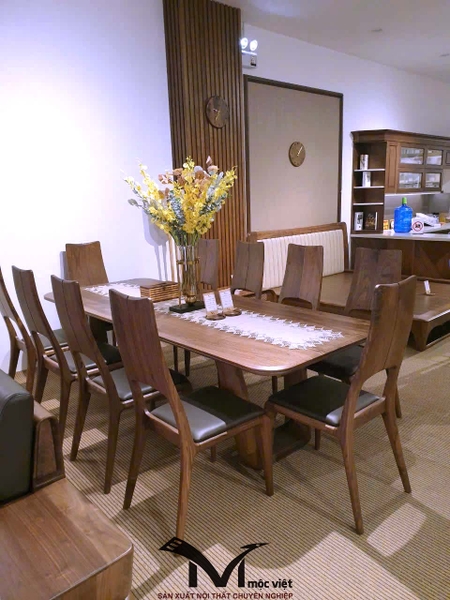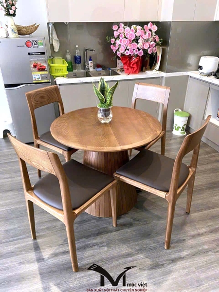 Bộ bàn ăn gỗ tự nhiên cao cấp Mộc Việt được thiết kế tinh tế, sang trọng, mang đến không gian ấm cúng và tiện nghi cho phòng bếp gia đình.